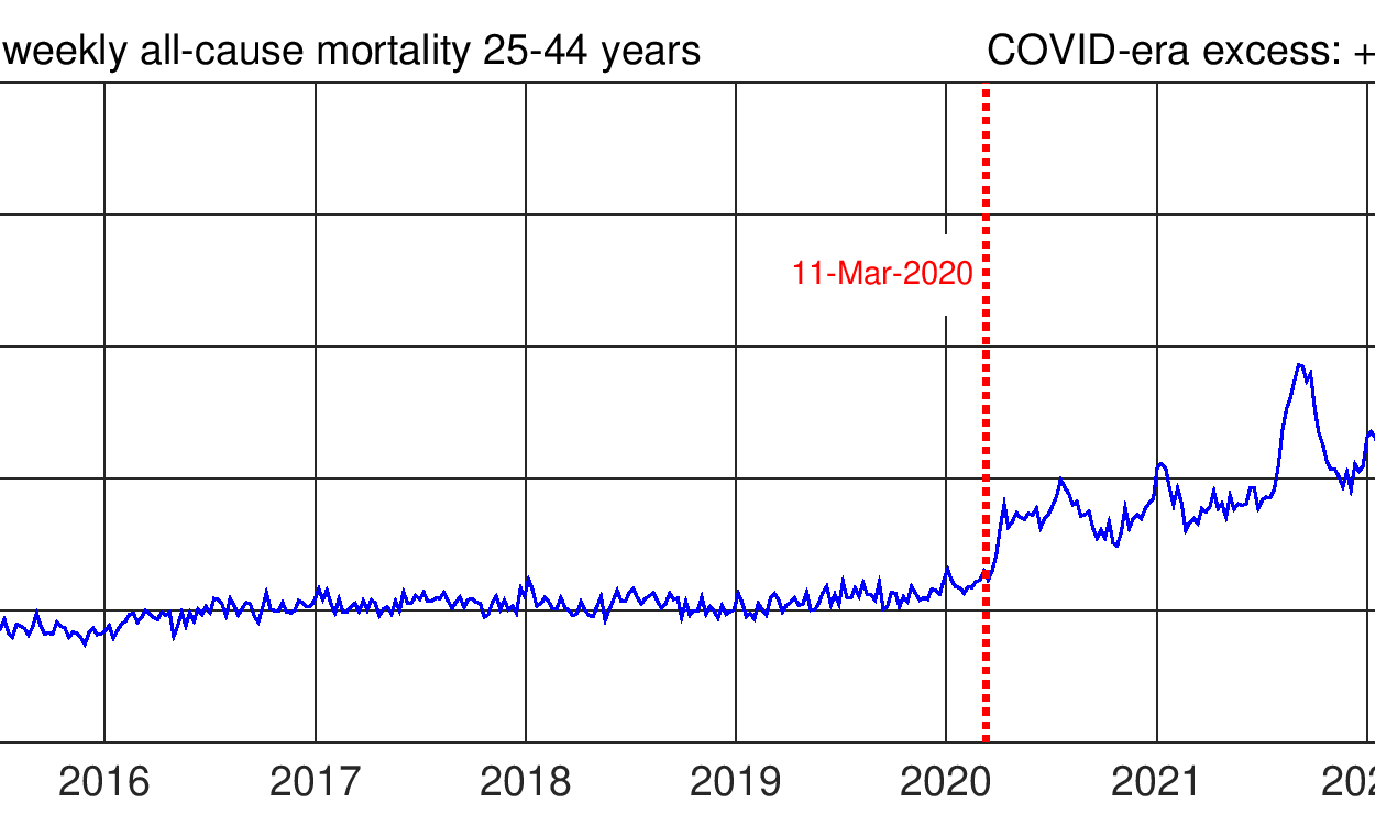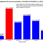 Effects that began with COVID-19 continue to cause the largest relative excess mortality (+42%) in the age group of 25 to 44 year-olds in the USA.